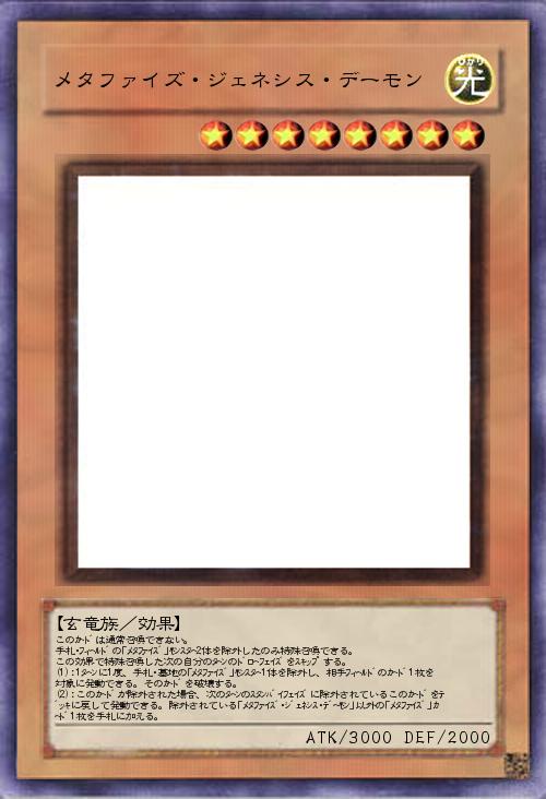 | このカードは通常召喚できない。 手札・フィールドの「メタファイズ」モンスター2体を除外したのみ特殊召喚できる。 この効果で特殊召喚した次の自分のターンのドローフェイズをスキップする。 (1):1ターンに1度、手札・墓地の「メタファイズ」モンスター1体を除外し、相手フィールドのカード1枚を対象に発動できる。そのカードを破壊する。 (2):このカードが除外された場合、次のターンのスタンバイフェイズに除外されているこのカードをデッキに戻して発動できる。除外されている「メタファイズ・ジェネシス・デーモン」以外の「メタファイズ」カード1枚を手札に加える。 | |||