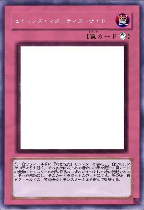 | ①:自分フィールドに「紫毒呪女」モンスターが存在し、自分のLPが相手よりも低く、その差が倍以上ある場合に相手が魔法・罠カードの発動・モンスターの特殊召喚のいずれか1つをした時に発動できる。それを無効にし、そのカードを持ち主のデッキに戻す。その後、自分フィールドの「紫毒呪女」モンスター1体を選んで破壊する。 | |||
