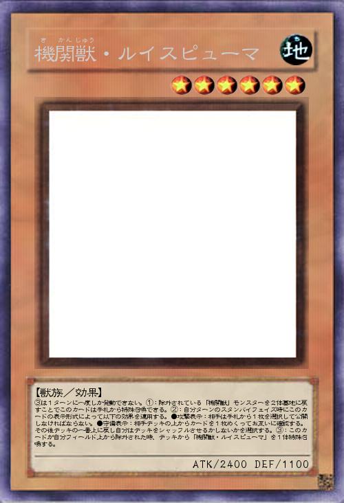 | ③は1ターンに一度しか発動できない。①:除外されている「機関獣」モンスターを2体墓地に戻すことでこのカードは手札から特殊召喚できる。②:自分ターンのスタンバイフェイズ時にこのカードの表示形式によって以下の効果を適用する。●攻撃表示:相手は手札から1枚を選択して公開しなければならない。●守備表示:相手デッキの上からカードを1枚めくってお互いに確認する。その後デッキの一番上に戻し自分はデッキをシャッフルさせるかしないかを選択する。③:このカードが自分フィールド上から除外された時、デッキから「機関獣・ルイスピューマ」を1体特殊召喚する。 | |||