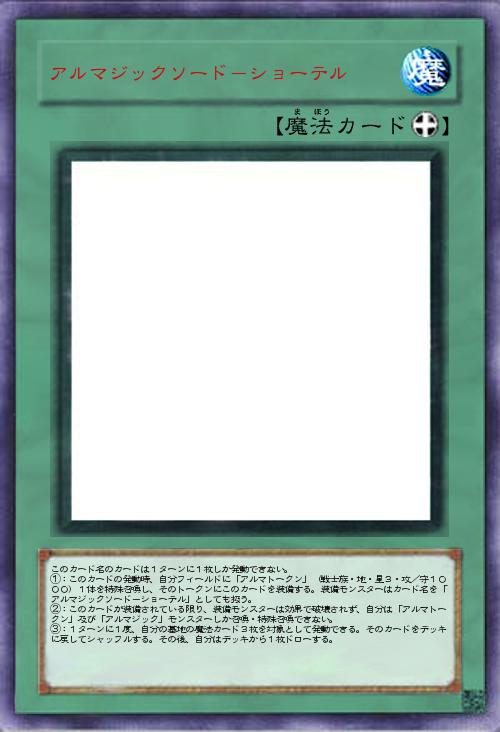 | このカード名のカードは1ターンに1枚しか発動できない。 ①:このカードの発動時、自分フィールドに「アルマトークン」(戦士族・地・星3・攻/守1000)1体を特殊召喚し、そのトークンにこのカードを装備する。装備モンスターはカード名を「アルマジックソード-ショーテル」としても扱う。 ②:このカードが装備されている限り、装備モンスターは効果で破壊されず、自分は「アルマトークン」及び「アルマジック」モンスターしか召喚・特殊召喚できない。 ③:1ターンに1度、自分の墓地の魔法カード3枚を対象として発動できる。そのカードをデッキに戻してシャッフルする。その後、自分はデッキから1枚ドローする。 | |||