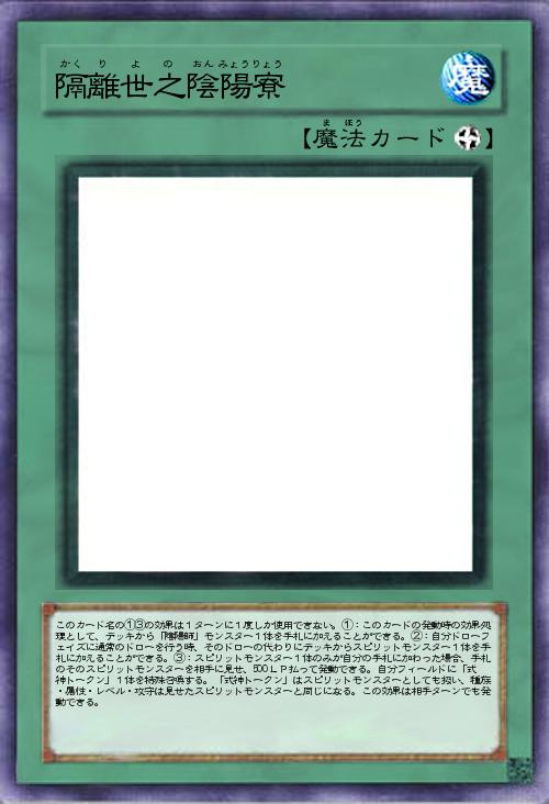 | このカード名の①③の効果は1ターンに1度しか使用できない。①:このカードの発動時の効果処理として、デッキから「陰陽師」モンスター1体を手札に加えることができる。②:自分ドローフェイズに通常のドローを行う時、そのドローの代わりにデッキからスピリットモンスター1体を手札に加えることができる。③:スピリットモンスター1体のみが自分の手札に加わった場合、手札のそのスピリットモンスターを相手に見せ、500LP払って発動できる。自分フィールドに「式神トークン」1体を特殊召喚する。「式神トークン」はスピリットモンスターとしても扱い、種族・属性・レベル・攻守は見せたスピリットモンスターと同じになる。この効果は相手ターンでも発動できる。 | |||