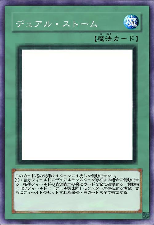 | このカード名の効果は1ターンに1度しか発動できない。 ①:自分フィールドにデュアルモンスターが存在する場合に発動できる。相手フィールドの表側表示の魔法カードを全て破壊する。発動時に自分フィールドに「ヴェル騎士団」モンスターが存在する場合、さらにフィールドのセットされた魔法・罠カードも全て破壊する。 | |||