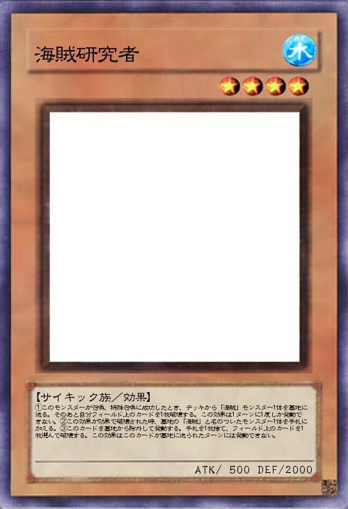 | ①このモンスターが召喚、特殊召喚に成功したとき、デッキから「海賊」モンスター1体を墓地に送る。そのあと自分フィールド上のカードを1枚破壊する。この効果は1ターンに1度しか発動できない。②この効果が効果で破壊された時、墓地の「海賊」と名のついたモンスター1体を手札に加える。③このカードを墓地から除外して発動する。手札を1枚捨て、フィールド上のカードを1枚選んで破壊する。この効果はこのカードが墓地に送られたターンには発動できない。 | |||