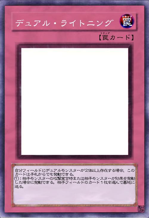 | 自分フィールドにデュアルモンスターが2体以上存在する場合、このカードは手札からでも発動できる。 ①:相手モンスターの攻撃宣言時または相手モンスターが効果を発動した場合に発動できる。相手フィールドのカード1枚を選んで墓地に送る。 | |||
