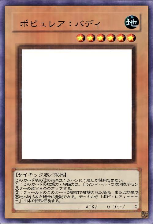 | このカード名の②の効果は1ターンに1度しか使用できない。 ①:このカードの攻撃力・守備力は、自分フィールドの表側表示モンスターの数×800アップする。 ②:フィールドのこのカードが戦闘で破壊された場合、または効果で墓地へ送られた場合に発動できる。デッキから「ポピュレア:ーーーー」1体を特殊召喚する。 | |||