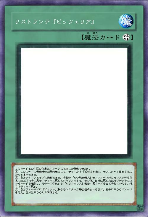 | このカード名の①②の効果は1ターンに1度しか発動できない。 ①:このカードの発動時の効果処理として、デッキから「ピザ焼き職人」モンスター1体を手札に加える事ができる。 ②:自分メインフェイズに発動できる。手札の「ピザ焼き職人」モンスター以外のモンスターを任意の数だけ相手に見せ、デッキに戻してシャッフルする。その後、自分は戻した数だけデッキの上からカードを確認し、その中に存在する「ピッツェリア」魔法・罠カードを全て手札に加える。残りはデッキに戻す。 ③:自分フィールドに「ピッツァ」融合モンスターが融合召喚される度に、相手に500ダメージを与え、自分は500LP回復する。 | |||