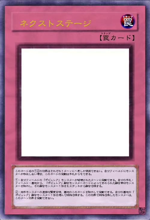 | このカード名の①②の効果はそれぞれ1ターンに1度しか使用できない。自分フィールドにモンスターが存在しない場合、このカードの発動は手札からもできる。 ①:自分フィールドの「ポピュレア」モンスターが破壊されたターンに発動できる。自分の手札・フィールド・墓地から、「ポピュレア」融合モンスターカードによってきめられた融合素材モンスターを除外し、その融合モンスター1体をEXデッキから融合召喚する。 ②:相手モンスターの直接攻撃宣言時、墓地のこのカードを除外して発動できる。自分の墓地の「ポピュレア」融合モンスター1体を選んで特殊召喚する。この効果で特殊召喚したモンスターは、このターン効果を発動できない。 | |||