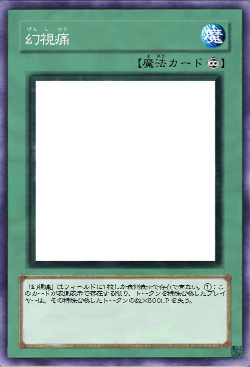 | 「幻視痛」はフィールドに1枚しか表側表示で存在できない。①:このカードが表側表示で存在する限り、トークンを特殊召喚したプレイヤーは、その特殊召喚したトークンの数×800LPを失う。 | |||