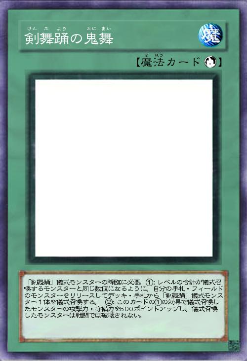 | 「剣舞踊」儀式モンスターの降臨に必要。①:レベルの合計が儀式召喚するモンスターと同じ数値になるように、自分の手札・フィールドのモンスターをリリースしてデッキ・手札から「剣舞踊」儀式モンスター1体を儀式召喚する。 ②:このカードの①の効果で儀式召喚したモンスターの攻撃力・守備力を500ポイントアップし、儀式召喚したモンスターは戦闘では破壊されない。 | |||