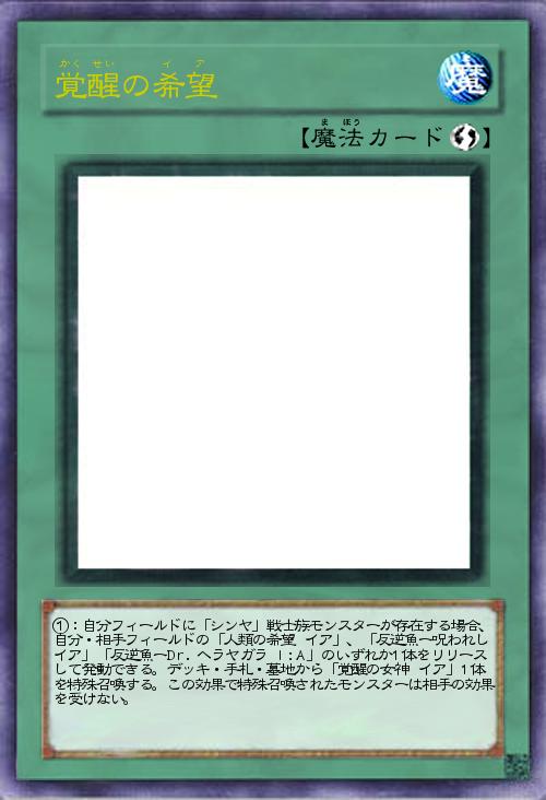 | ①:自分フィールドに「シンヤ」戦士族モンスターが存在する場合、自分・相手フィールドの「人類の希望 イア」、「反逆魚ー呪われしイア」「反逆魚ーDr.ヘラヤガラ I:A」のいずれか1体をリリースして発動できる。デッキ・手札・墓地から「覚醒の女神 イア」1体を特殊召喚する。この効果で特殊召喚されたモンスターは相手の効果を受けない。 | |||
