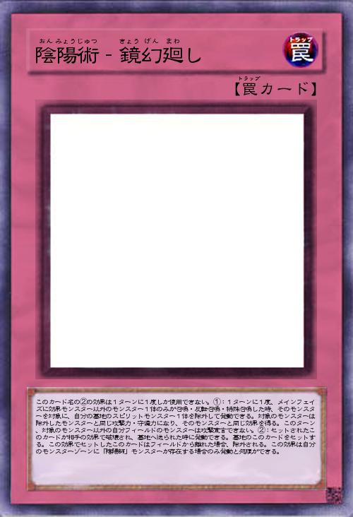 | このカード名の②の効果は1ターンに1度しか使用できない。①:1ターンに1度、メインフェイズに効果モンスター以外のモンスター1体のみが召喚・反転召喚・特殊召喚した時、そのモンスターを対象に、自分の墓地のスピリットモンスター1体を除外して発動できる。対象のモンスターは除外したモンスターと同じ攻撃力・守備力になり、そのモンスターと同じ効果を得る。このターン、対象のモンスター以外の自分フィールドのモンスターは攻撃宣言できない。②:セットされたこのカードが相手の効果で破壊され、墓地へ送られた時に発動できる。墓地のこのカードをセットする。この効果でセットしたこのカードはフィールドから離れた場合、除外される。この効果は自分のモンスターゾーンに「陰陽師」モンスターが存在する場合のみ発動と処理ができる。 | |||