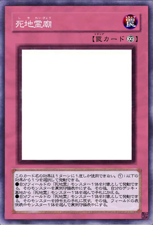 | このカード名の効果は1ターンに1度しか使用できない。①:以下の効果から1つを選択して発動できる。 ●自分フィールドの「死地霊」モンスター1体を対象として発動できる。そのモンスターを裏側守備表示にする。その後、自分のデッキ・墓地から「死地霊」モンスター1体を選んで手札に加える。 ●自分フィールドの「死地霊」モンスター1体を対象として発動できる。そのモンスターを持ち主の手札に戻す。その後、フィールドの表側表示モンスター1体を選んで裏側守備表示にする。 | |||