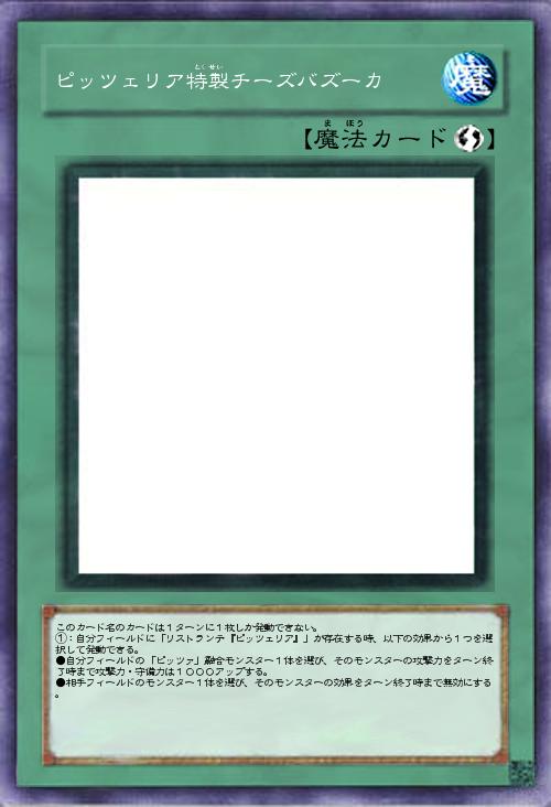 | このカード名のカードは1ターンに1枚しか発動できない。 ①:自分フィールドに「リストランテ『ピッツェリア』」が存在する時、以下の効果から1つを選択して発動できる。 ●自分フィールドの「ピッツァ」融合モンスター1体を選び、そのモンスターの攻撃力をターン終了時まで攻撃力・守備力は1000アップする。 ●相手フィールドのモンスター1体を選び、そのモンスターの効果をターン終了時まで無効にする。 | |||