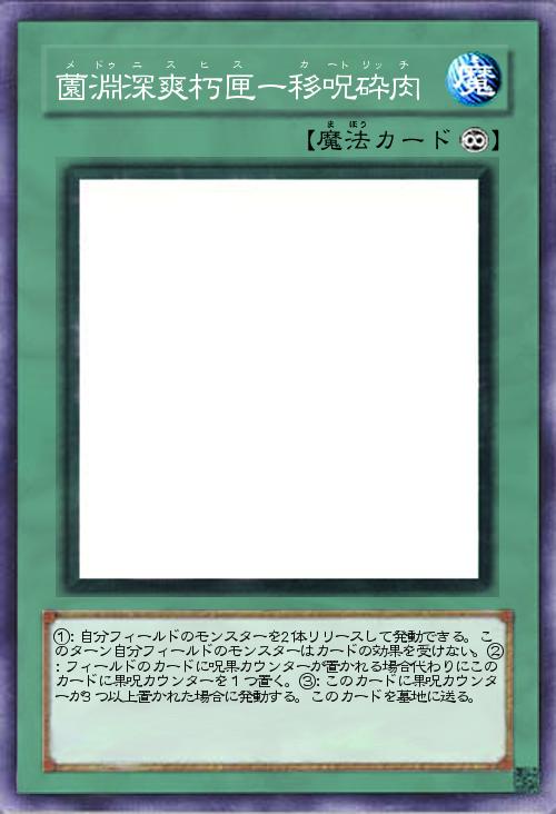 | ①:自分フィールドのモンスターを2体リリースして発動できる。このターン自分フィールドのモンスターはカードの効果を受けない。②:フィールドのカードに呪果カウンターが置かれる場合代わりにこのカードに果呪カウンターを1つ置く。③:このカードに果呪カウンターが3つ以上置かれた場合に発動する。このカードを墓地に送る。 | |||