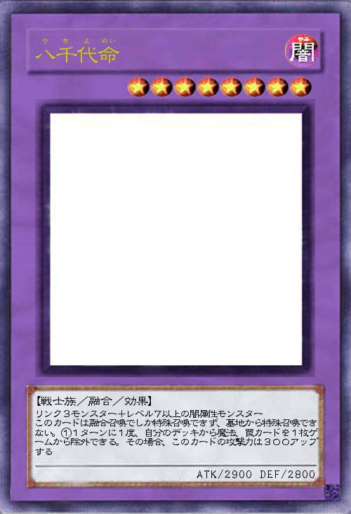 | リンク3モンスター+レベル7以上の闇属性モンスター このカードは融合召喚でしか特殊召喚できず、墓地から特殊召喚できない。①1ターンに1度、自分のデッキから魔法、罠カードを1枚ゲームから除外できる。その場合、このカードの攻撃力は300アップする | |||