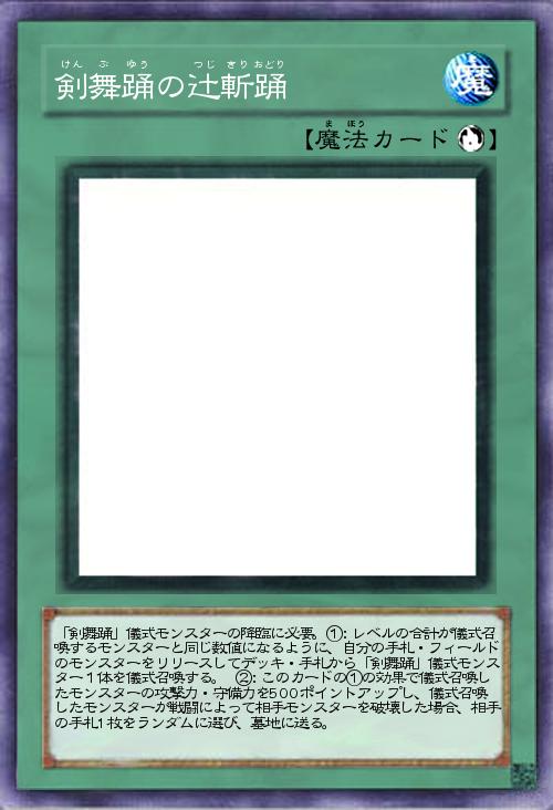 | 「剣舞踊」儀式モンスターの降臨に必要。①:レベルの合計が儀式召喚するモンスターと同じ数値になるように、自分の手札・フィールドのモンスターをリリースしてデッキ・手札から「剣舞踊」儀式モンスター1体を儀式召喚する。 ②:このカードの①の効果で儀式召喚したモンスターの攻撃力・守備力を500ポイントアップし、儀式召喚したモンスターが戦闘によって相手モンスターを破壊した場合、相手の手札1枚をランダムに選び、墓地に送る。 | |||