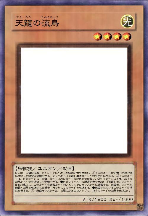 | 自分は「天籠の流鳥」を1ターンに1度しか特殊召喚できない。①:このカードが召喚・特殊召喚に成功した場合に発動できる。デッキから「天籠」魔法カード1枚を手札に加える。②:このカードは、自分ターンに「天籠」カード以外のカードの効果を受けない。③:1ターンに1度、以下の効果から1つを選択して発動できる。●自分フィールドの通常召喚できない「天籠」モンスター1体を対象とし、このカードを装備カード扱いとしてそのモンスターに装備する。装備モンスターが戦闘・効果で破壊される場合、代わりにこのカードを破壊する。●装備されているこのカードを特殊召喚する。④:装備モンスターは、攻撃力が800アップし、相手のカードの効果を受けない。 | |||
