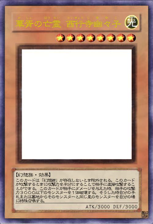 | このカードは「幻想郷」が存在しないとき除外される。このカードが攻撃するときに攻撃力を半分にすることで相手に直接攻撃することができる。このカードが相手にダメージを与えた時、相手の攻撃力3000以下のモンスターを1体破壊する。そうした時自分の手札または墓地からそのモンスターと同じ星のモンスターを自分の場に特殊召喚する。 | |||