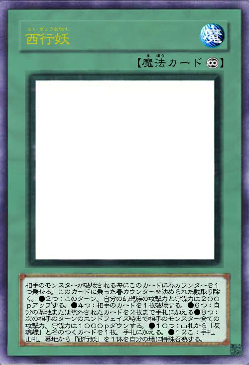 | 相手のモンスターが破壊される毎にこのカードに春カウンターを1つ乗せる。このカードに乗った春カウンターを決められた数取り除く。●2つ:このターン、自分の幻想族の攻撃力と守備力は200pアップする。●4つ:相手のカードを1枚破壊する。●6つ:自分の墓地または除外されたカードを2枚まで手札に加える●8つ:次の相手のターンのエンドフェイズ時まで相手のモンスター全ての攻撃力、守備力は1000pダウンする。●10つ:山札から「反魂蝶」と名のつくカードを1枚、手札に加える。●12こ:手札、山札、墓地から「西行妖」を1体を自分の場に特殊召喚する。 | |||