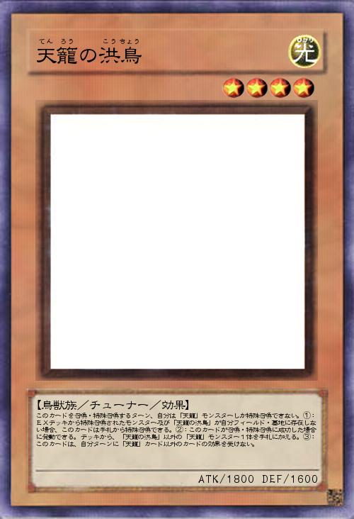 | このカードを召喚・特殊召喚するターン、自分は「天籠」モンスターしか特殊召喚できない。①:EXデッキから特殊召喚されたモンスター及び「天籠の洪鳥」が自分フィールド・墓地に存在しない場合、このカードは手札から特殊召喚できる。②:このカードが召喚・特殊召喚に成功した場合に発動できる。デッキから、「天籠の洪鳥」以外の「天籠」モンスター1体を手札に加える。③:このカードは、自分ターンに「天籠」カード以外のカードの効果を受けない。 | |||