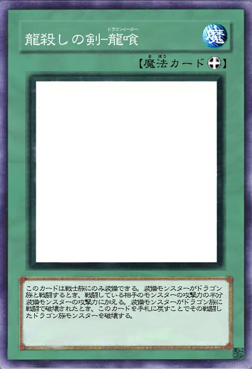 | このカードは戦士族にのみ装備できる。装備モンスターがドラゴン族と戦闘するとき、戦闘している相手のモンスターの攻撃力の半分装備モンスターの攻撃力に加える。装備モンスターがドラゴン族に戦闘で破壊されたとき、このカードを手札に戻すことでその戦闘したドラゴン族モンスターを破壊する。 | |||