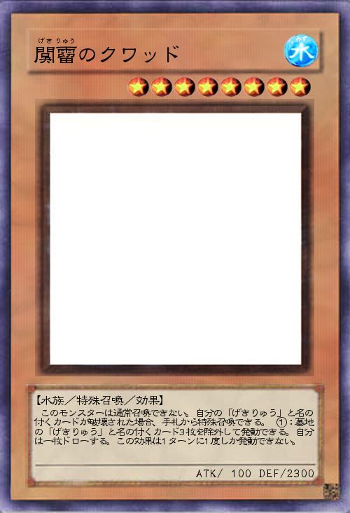 | このモンスターは通常召喚できない。自分の「げきりゅう」と名の付くカードが破壊された場合、手札から特殊召喚できる。 ①:墓地の「げきりゅう」と名の付くカード3枚を除外して発動できる。自分は一枚ドローする。この効果は1ターンに1度しか発動できない。 | |||