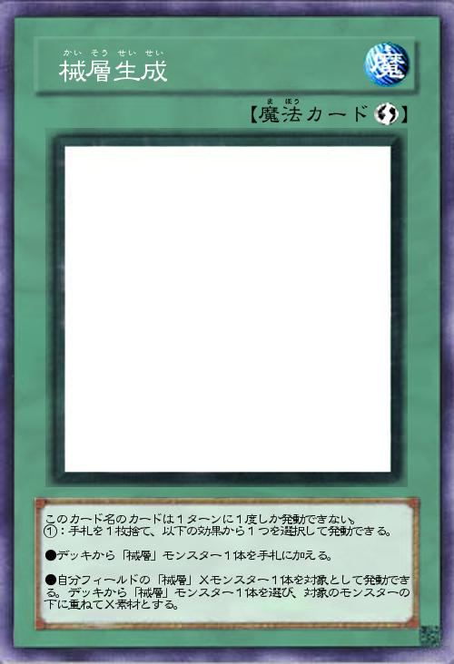 | このカード名のカードは1ターンに1度しか発動できない。 ①:手札を1枚捨て、以下の効果から1つを選択して発動できる。 ●デッキから「械層」モンスター1体を手札に加える。 ●自分フィールドの「械層」Xモンスター1体を対象として発動できる。デッキから「械層」モンスター1体を選び、対象のモンスターの下に重ねてX素材とする。 | |||