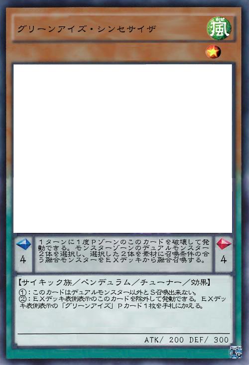 | ①:このカードはデュアルモンスター以外とS召喚出来ない。 ②:EXデッキ表側表示のこのカードを除外して発動できる。EXデッキ表側表示の「グリーンアイズ」Pカード1枚を手札に加える。 | |||