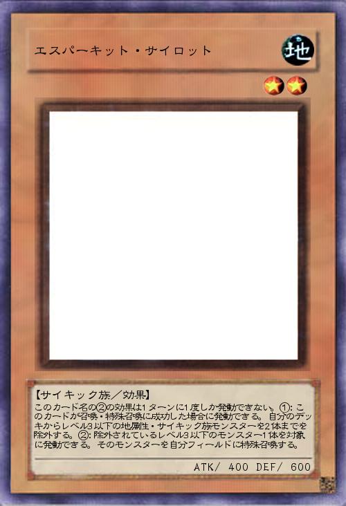 | このカード名の②の効果は1ターンに1度しか発動できない。①:このカードが召喚・特殊召喚に成功した場合に発動できる。自分のデッキからレベル3以下の地属性・サイキック族モンスターを2体までを除外する。②:除外されているレベル3以下のモンスター1体を対象に発動できる。そのモンスターを自分フィールドに特殊召喚する。 | |||
