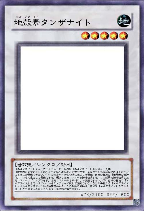 | 「エルブライド」チューナー+チューナー以外の「エルブライド」モンスター1体 「地殻素タンザナイト」は1ターンに1度しかS召喚できず、このカード名の②の効果は1ターンに1度しか発動できない。①:このカードがS召喚に成功した場合、自分の墓地の「地殻素の御神体」1体を対象として発動できる。選択したモンスターを特殊召喚する。この効果で特殊召喚したモンスターは「エルブライド」SモンスターのS素材にしか使用できない。②:自分の墓地の「エルブライド」Sモンスター1体をEXデッキに戻して発動できる。自分の手札から「エルブライド」レベル4モンスター1体を通常召喚する。この効果の発動後、自分は「エルブライド」SモンスターしかEXデッキからモンスターを特殊召喚できない。 | |||