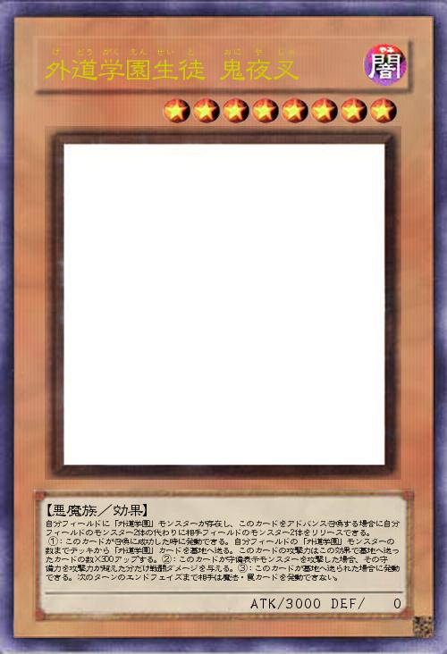 | 自分フィールドに「外道学園」モンスターが存在し、このカードをアドバンス召喚する場合に自分フィールドのモンスター2体の代わりに相手フィールドのモンスター2体をリリースできる。 ①:このカードが召喚に成功した時に発動できる。自分フィールドの「外道学園」モンスターの数までデッキから「外道学園」カードを墓地へ送る。このカードの攻撃力はこの効果で墓地へ送ったカードの数×300アップする。②:このカードが守備表示モンスターを攻撃した場合、その守備力を攻撃力が超えた分だけ戦闘ダメージを与える。③:このカードが墓地へ送られた場合に発動できる。次のターンのエンドフェイズまで相手は魔法・罠カードを発動できない。 | |||