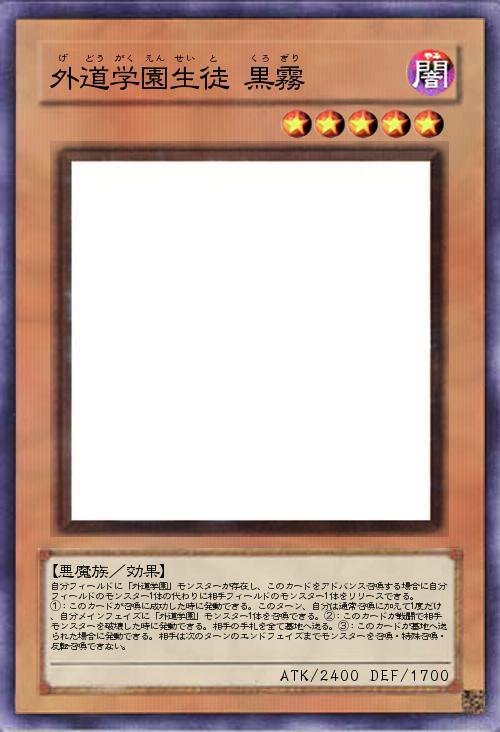 | 自分フィールドに「外道学園」モンスターが存在し、このカードをアドバンス召喚する場合に自分フィールドのモンスター1体の代わりに相手フィールドのモンスター1体をリリースできる。 ①:このカードが召喚に成功した時に発動できる。このターン、自分は通常召喚に加えて1度だけ、自分メインフェイズに「外道学園」モンスター1体を召喚できる。②:このカードが戦闘で相手モンスターを破壊した時に発動できる。相手の手札を全て墓地へ送る。③:このカードが墓地へ送られた場合に発動できる。相手は次のターンのエンドフェイズまでモンスターを召喚・特殊召喚・反転召喚できない。 | |||