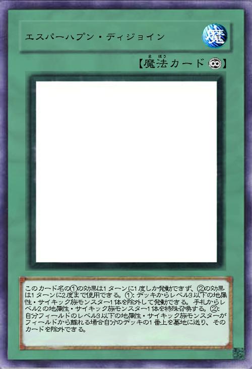 | このカード名の①の効果は1ターンに1度しか発動できず、②の効果は1ターンに2度まで使用できる。①:デッキからレベル3以下の地属性・サイキック族モンスター1体を除外して発動できる。手札からレベル2の地属性・サイキック族モンスター1体を特殊召喚する。②:自分フィールドのレベル3以下の地属性・サイキック族モンスターがフィールドから離れる場合自分のデッキの1番上を墓地に送り、そのカードを除外できる。 | |||