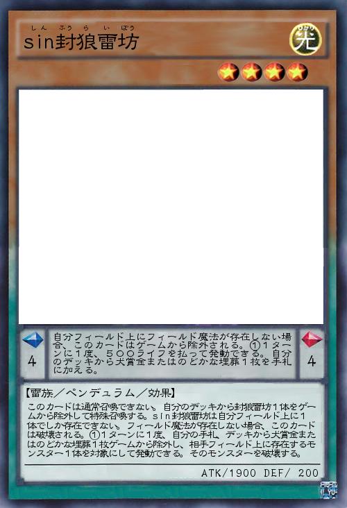 | このカードは通常召喚できない。自分のデッキから封狼雷坊1体をゲームから除外して特殊召喚する。sin封狼雷坊は自分フィールド上に1体でしか存在できない。フィールド魔法が存在しない場合、このカードは破壊される。①1ターンに1度、自分の手札、デッキから犬賞金またはのどかな埋葬1枚ゲームから除外し、相手フィールド上に存在するモンスター1体を対象にして発動できる。そのモンスターを破壊する。 | |||