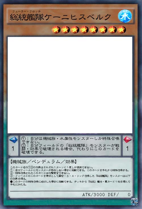 | ①:自分は機械族・水属性モンスターしか特殊召喚できない。 ②:自分フィールドの「総統艦隊」モンスターが戦闘・効果で破壊される場合、代わりにこのカードを破壊できる。 | |||