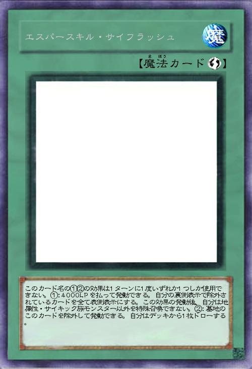 | このカード名の①②の効果は1ターンに1度いずれか1つしか使用できない。①:4000LPを払って発動できる。自分の裏側表示で除外されているカードを全て表側表示にする。この効果の発動後、自分は地属性・サイキック族モンスター以外を特殊召喚できない。②:墓地のこのカードを除外して発動できる。自分はデッキから1枚ドローする。 | |||