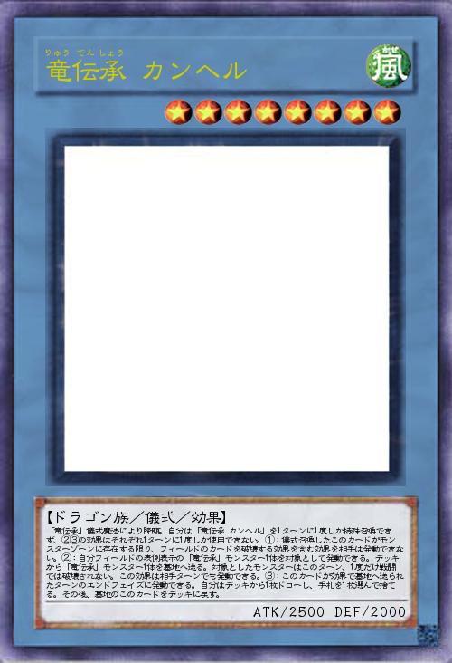 | 「竜伝承」儀式魔法により降臨。自分は「竜伝承 カンヘル」を1ターンに1度しか特殊召喚できず、②③の効果はそれぞれ1ターンに1度しか使用できない。①:儀式召喚したこのカードがモンスターゾーンに存在する限り、フィールドのカードを破壊する効果を含む効果を相手は発動できない。②:自分フィールドの表側表示の「竜伝承」モンスター1体を対象として発動できる。デッキから「竜伝承」モンスター1体を墓地へ送る。対象としたモンスターはこのターン、1度だけ戦闘では破壊されない。この効果は相手ターンでも発動できる。③:このカードが効果で墓地へ送られたターンのエンドフェイズに発動できる。自分はデッキから1枚ドローし、手札を1枚選んで捨てる。その後、墓地のこのカードをデッキに戻す。 | |||