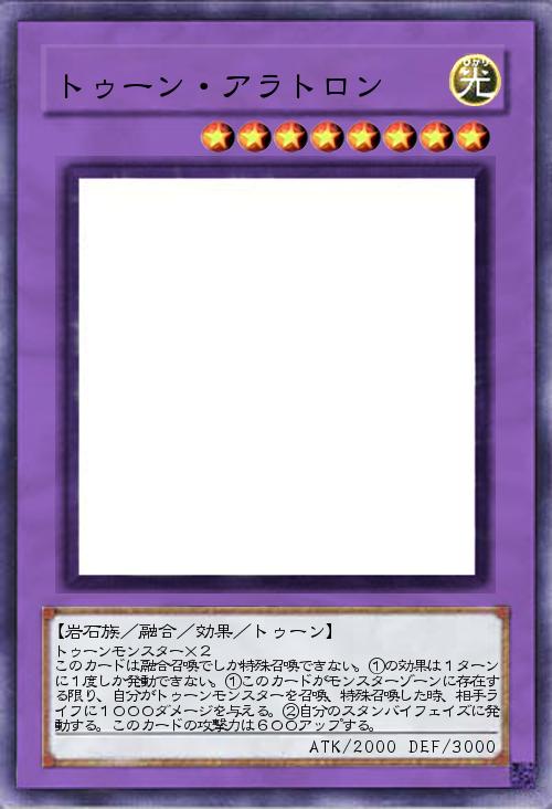 | トゥーンモンスター×2 このカードは融合召喚でしか特殊召喚できない。①の効果は1ターンに1度しか発動できない。①このカードがモンスターゾーンに存在する限り、自分がトゥーンモンスターを召喚、特殊召喚した時、相手ライフに1000ダメージを与える。②自分のスタンバイフェイズに発動する。このカードの攻撃力は600アップする。 | |||