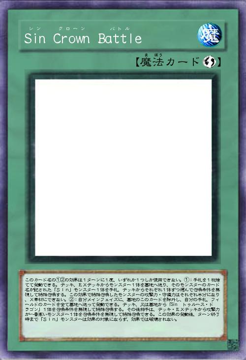 | このカード名の①②の効果は1ターンに1度、いずれか1つしか使用できない。①:手札を1枚捨てて発動できる。デッキ、EXデッキからモンスター1体を墓地へ送り、そのモンスターのカード名が記された「Sin」モンスター1体を手札、デッキからそれぞれ1体ずつ選んで召喚条件を無視して特殊召喚する。この効果で特殊召喚したモンスターの攻撃力・守備力はそれぞれ半分になり、X素材にできない。②:自分メインフェイズに、墓地のこのカードを除外し、自分の手札、フィールドのカードを全て墓地へ送って発動できる。デッキ、又は墓地から「Sin トゥルース・ドラゴン」1体を召喚条件を無視して特殊召喚する。その後相手は、デッキ・EXデッキから攻撃力が一番高いモンスター1体を召喚条件を無視して特殊召喚できる。この効果の発動後、ターン終了時まで「Sin」モンスターは効果の対象にならず、効果では破壊されない。 | |||