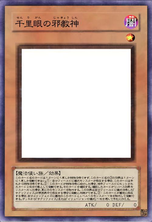 | このカード名のカードは1ターンに1度しか特殊召喚できず、このカード名の③の効果は1ターンに1度しか発動できない。①:自分フィールドに儀式モンスターが存在する場合、このカードは手札から特殊召喚できる。②:このカードが特殊召喚に成功した場合、相手フィールドにセットされたカード2枚を対象として発動できる。そのカードを確認する。確認したカードがリバース効果モンスターだった場合、更にそのモンスターを除外する。この効果は自分フィールドに儀式召喚した「サクリファイス」が表側表示で存在する場合に発動と処理ができる。③:このカードが墓地に存在する場合、自分メインフェイズに墓地のこのカードとレベル1のモンスター1体を除外して発動できる。デッキから「サクリファイス」または「イリュージョンの儀式」1枚を選んで手札に加える。 | |||