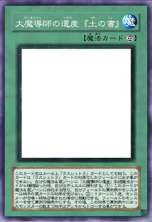 | このカード名はルール上「ラスシュトラ」カードとしても扱う。このカードは「ラスシュトラ」カードの効果でしかフィールドに出す事ができない。自分の魔法&罠ゾーンに「大魔導師の遺産」永続魔法カードが4種類揃った時、自分はデュエルに勝利する。①:このカードが魔法&罠ゾーンに存在する限り、自分フィールドの裏側表示モンスターは相手の罠カードの効果を受けない。②:1ターンに1度、モンスターが召喚・特殊召喚された場合に発動できる。フィールドのモンスターを全て裏側守備表示にする。その後、この効果で裏側表示になったモンスターの数まで相手はデッキからドローする事ができる。 | |||