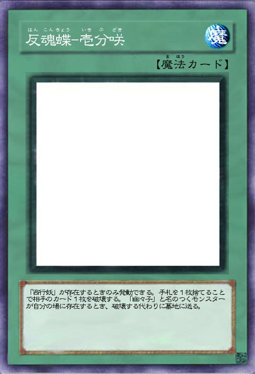 | 「西行妖」が存在するときのみ発動できる。手札を1枚捨てることで相手のカード1枚を破壊する。「幽々子」と名のつくモンスターが自分の場に存在するとき、破壊する代わりに墓地に送る。 | |||