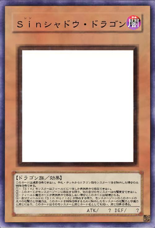 | このカードは通常召喚できない。手札・デッキからドラゴン族モンスター1体を除外した場合のみ特殊召喚できる。 ①:「Sin」モンスターはフィールドに1体しか表側表示で存在できない。 ②:このカードがモンスターゾーンに存在する限り、他の自分のモンスターは攻撃宣言できない。 ③:フィールド魔法カードが表側表示で存在しない場合にこのカードは破壊される。 ④:自分フィールドに「Sin World」が存在する限り、モンスターゾーンのこのカードの元々の攻撃力と守備力は、このカードを特殊召喚するために除外したモンスターの攻撃力と守備力と同じになり、このカードはそのモンスターと同じカード名としても扱い、同じ効果を得る。 | |||