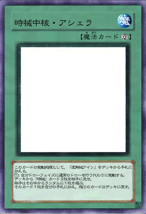 | このカードの発動処理として、「虚無械アイン」をデッキから手札に加える。 ①:自分ドローフェイズに通常のドローを行う代わりに発動する。 デッキから「時械」カード3枚を相手に見せ、 相手はその中からランダムに1枚を選ぶ。 そのカード1枚を自分の手札に加え、残りのカードはデッキに戻す。 | |||