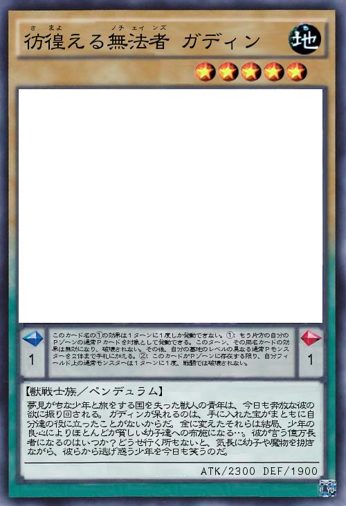 | このカード名の①の効果は1ターンに1度しか発動できない。①:もう片方の自分のPゾーンの通常Pカードを対象として発動できる。このターン、その同名カードの効果は無効になり、破壊されない。その後、自分の墓地のレベルの異なる通常Pモンスターを2体まで手札に加える。②:このカードがPゾーンに存在する限り、自分フィールド上の通常モンスターは1ターンに1度、戦闘では破壊されない。 | |||