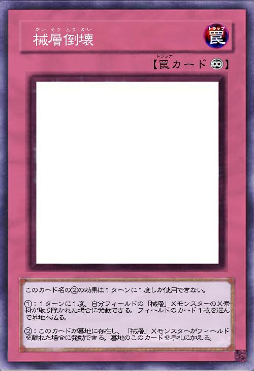 | このカード名の②の効果は1ターンに1度しか使用できない。 ①:1ターンに1度、自分フィールドの「械層」XモンスターのX素材が取り除かれた場合に発動できる。フィールドのカード1枚を選んで墓地へ送る。 ②:このカードが墓地に存在し、「械層」Xモンスターがフィールドを離れた場合に発動できる。墓地のこのカードを手札に加える。 | |||