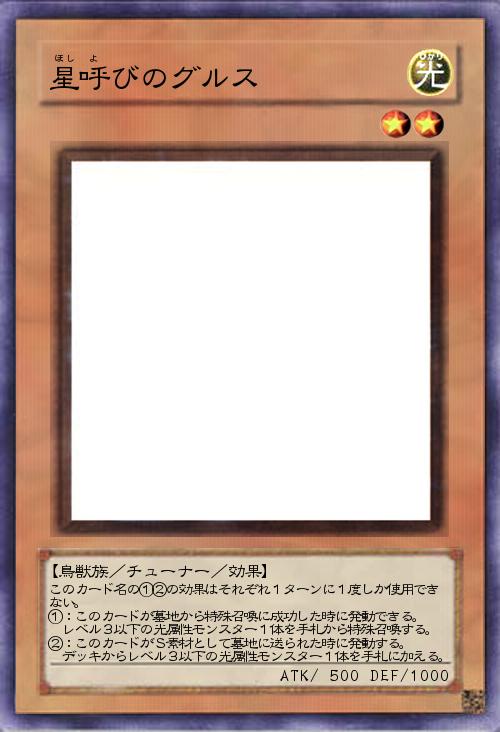 | このカード名の①②の効果はそれぞれ1ターンに1度しか使用でき ない。 ①:このカードが墓地から特殊召喚に成功した時に発動できる。 レベル3以下の光属性モンスター1体を手札から特殊召喚する。 ②:このカードがS素材として墓地に送られた時に発動する。 デッキからレベル3以下の光属性モンスター1体を手札に加える。 | |||