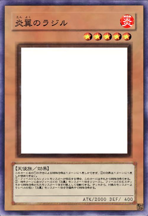 | このカード名の①の方法による特殊召喚は1ターンに1度しかできず、②の効果は1ターンに1度しか使用できない。 ①:フィールドにエレメントモンスターが存在する場合、このカードは手札から特殊召喚できる。 ②:相手ターンに自分フィールドの「炎翼」モンスター1体をリリースし、フィールドのEXデッキから特殊召喚されたモンスター1体を対象として発動できる。デッキから、対象のモンスターよりレベルの低い「炎翼」モンスター1体を守備表示で特殊召喚する。 | |||