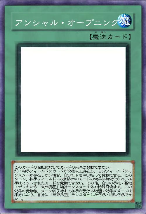 | このカードの発動に対してカードの効果は発動できない。 ①:相手フィールドにカードが2枚以上存在し、自分フィールドにモンスターが存在しない場合、自分LPを半分払って発動できる。このターン、相手フィールドに表側表示のカードの効果は無効化され、相手はセットされたカードを発動できない。その後、自分の手札・墓地・デッキから「天帝兵団」通常モンスター1体を特殊召喚する。この効果の発動後、ターン終了時まで相手が受ける戦闘・効果ダメージは半分になり、自分は「天帝兵団」モンスターしか召喚・特殊召喚できない。 | |||