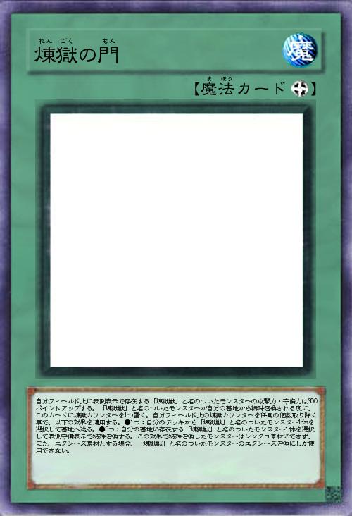 自分フィールド上に表側表示で存在する「煉獄獣」と名のついたモンスターの攻撃力・守備力は300ポイントアップする。「煉獄獣」と名のついたモンスターが自分の墓地から特殊召喚される度に、このカードに煉獄カウンターを1つ置く。自分フィールド上の煉獄カウンターを任意の個数取り除く事で、以下の効果を適用する。●1つ:自分のデッキから「煉獄獣」と名のついたモンスター1体を選択して墓地へ送る。●3つ:自分の墓地に存在する「煉獄獣」と名のついたモンスター1体を選択して表側守備表示で特殊召喚する。この効果で特殊召喚したモンスターはシンクロ素材にできず、また、エクシーズ素材とする場合、「煉獄獣」と名のついたモンスターのエクシーズ召喚にしか使用できない。 |